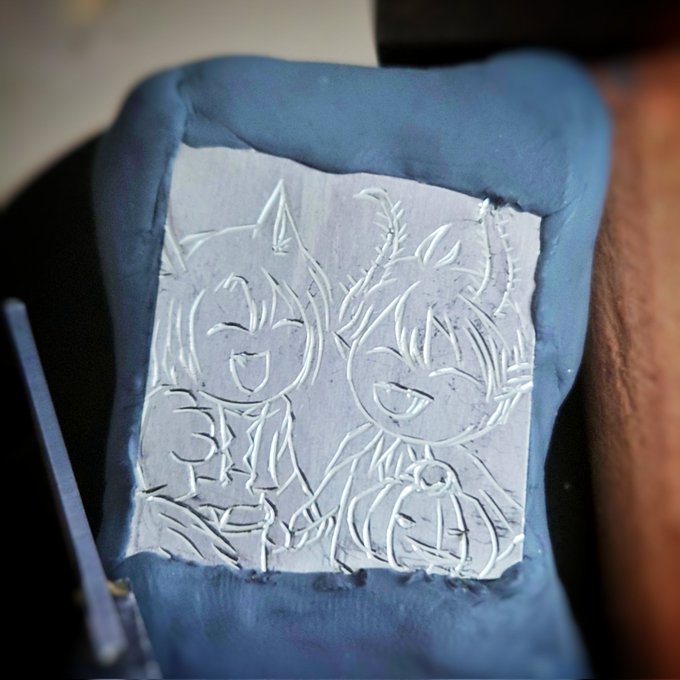 Draw Luca and Ren Zotto playing together in Halloween night on silver plate by engraving #TYOUKIN_ACG #drawluca #RenZottoArt #銀板彫金 #彫金
