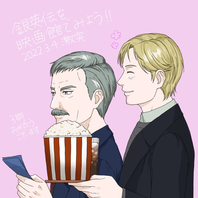#銀英伝DNT3期公開おめでとうファンアート ア『先輩、皆で映画観に行きませんか?』 ヤ『いいね。有給休暇でも使って行こうか。帝国も観に行くのに忙しくて、こちらに構ってられないだろ。1日くらい先輩がどうにかしてくれるだろ』 ア『はい決定!!人集めときますよ』 ユ『...』 第1章最高でした🙌