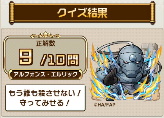 \ #鋼の錬金術師FA 検定クエスト/ #コトダマン で開催中! 私の挑戦結果:10問中、9問正解! 検定クエストで2問以上正解すると「★4~5鋼の錬金術師FAの実」をプレゼント! 今すぐ挑戦してみよう! ▼参加はこちら leaf.onelink.me/IDB6/471418a