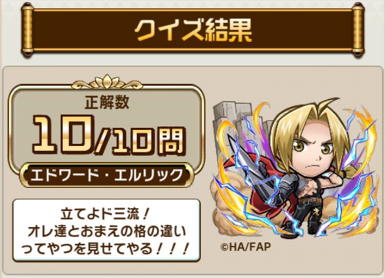 \ #鋼の錬金術師FA 検定クエスト/ #コトダマン で開催中! 私の挑戦結果:10問中、10問正解! 検定クエストで2問以上正解すると「★4~5鋼の錬金術師FAの実」をプレゼント! 今すぐ挑戦してみよう! ▼参加はこちら leaf.onelink.me/IDB6/471418a