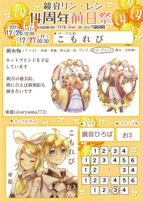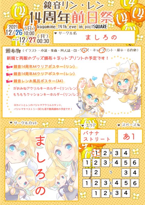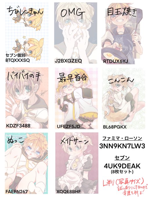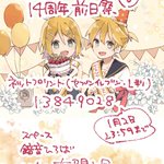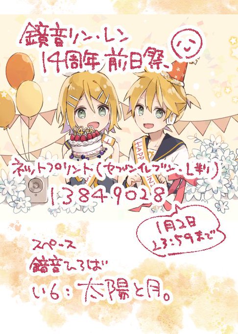 一応こちらでも。 ぬこレンレンの描きおろしイラストをネットプリント用意しました。 ○セブンイレブン予約番号46449510 ○ファミリーマート、ローソン他予約番号R63YR3J4FW #鏡音14周年前日祭