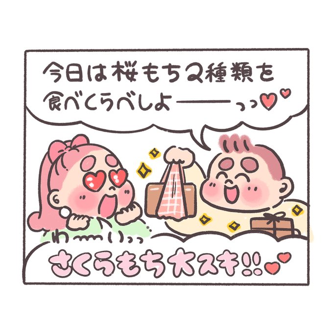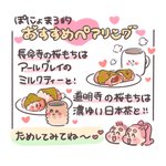 さくらもち食べ比べ♡ ぽにょ🍟「いろんなお店で桜フレーバーが出るこの季節、幸せ〜♡」 まろ🍩「ぼくはこの前カフェで飲んださくらミルクティーが美味しかったなあ🌸💕」 #ぽちゃ日和 #イラスト好きな人と繋がりたい #絵描きさんと繋がりたい #桜餅 #長命寺 #道明寺