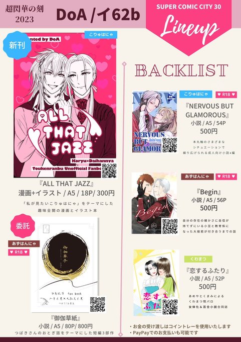 【5/3 超閃華の刻2023】★お品書き★ スパコミのお品書きと新刊のサンプルです! 【東1 イ62b / DoA】にてスペースを頂いております😊 当日はみなさまにお会いできることを楽しみにしております😃 ★新刊★サンプルはこちら↓ pixiv.net/artworks/10752… #長船収穫祭2_サークル