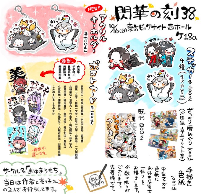 10/16閃華のお品書きできました! 今回からアクキーが初頒布になります。 前回夏コミで参加できなかった分の新ポスカ、ステッカーもでます。 ※創作キャラ関連は出ませんのでご注意ください。 【 #閃華の刻38 】お品書きでございます【イベント参加】 | ほたてぃーの #pixiv pixiv.net/artworks/10185…
