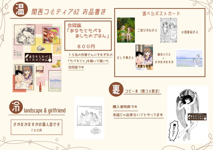 10/17(日) #関西コミティア62 #関コミ F-32 かなりあ食堂 「あなたとたべるあしたのごはん」 わたしも描かせていただきました合同誌が一足先に届きました! すごい! 個性的な作家さんが皆さま思い思いに作品を描かれているのですが、めっちゃきれいにまとまっています!