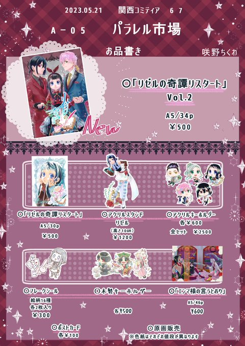2023.05.21の関西コミティアのお品書きです~! サークル名:パラレル市場 スペースNO.A-05 色紙もでき次第リプツリーにて繋げます! 良かったら遊びに来てください~!スペースにてお待ちしております!✨ #関西コミティア67 #お品書き #関西コミティア