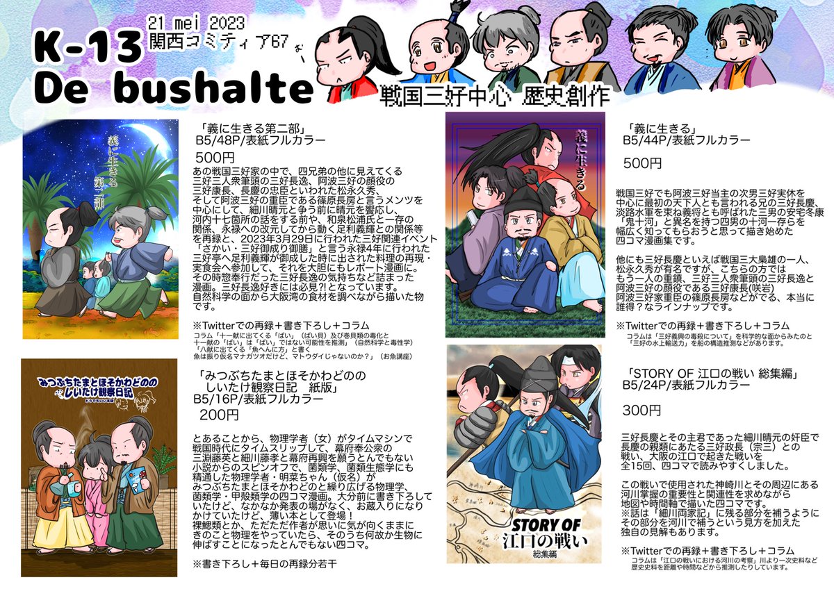 5月21日インテックス大阪で開かれる #関西コミティア67 に参加します。戦国三好で、幅広くの人が興味がなくても戦国時代の三好長慶その兄弟、一族を楽しめるように、様々な視点の四コマ漫画と御成の料理を再現した実食会に参加した漫画を描きました。 当日はよろしくお願いします! #関西コミティア… twitter.com/i/web/status/1…