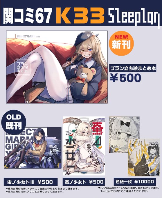 関西コミティアお品書きです! 新刊「プラン立ち絵まとめ本」と冬コミの「虫ノ少女トⅢ」と今回再販する「蚕ノ少女ト」頒布予定です! 色紙は先着順で、もし先着で何人かいたら抽選にしたいと思います。 K-33にてお待ちしております! #関西コミティア67 #関西コミティア