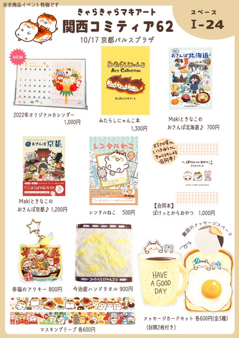 関西コミティアのお品書きはこちらになります🙇♀️ 10月17日(日)、京都パルスプラザにて開催です! スペース:I-24 になります✨ 明日は雨の予報で気温がぐっと下がりそうなので、ご来場予定の方はお気をつけてお越し下さい。 よろしくお願いします👏 #関西コミティア62 twitter.com/ccmakiart/stat…