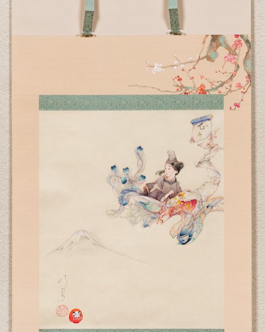 今回は、正月、ひな祭り、七夕、月見の4点の掛軸作品も展示販売しております。それぞれの季節に合わせた表装になっています。 ぜひ会場でご覧ください。 展覧会は4月11日(月)まで。 阪急うめだギャラリー(大阪)にて。 #阪急うめだギャラリー #阪急うめだ本店 #入江明日香