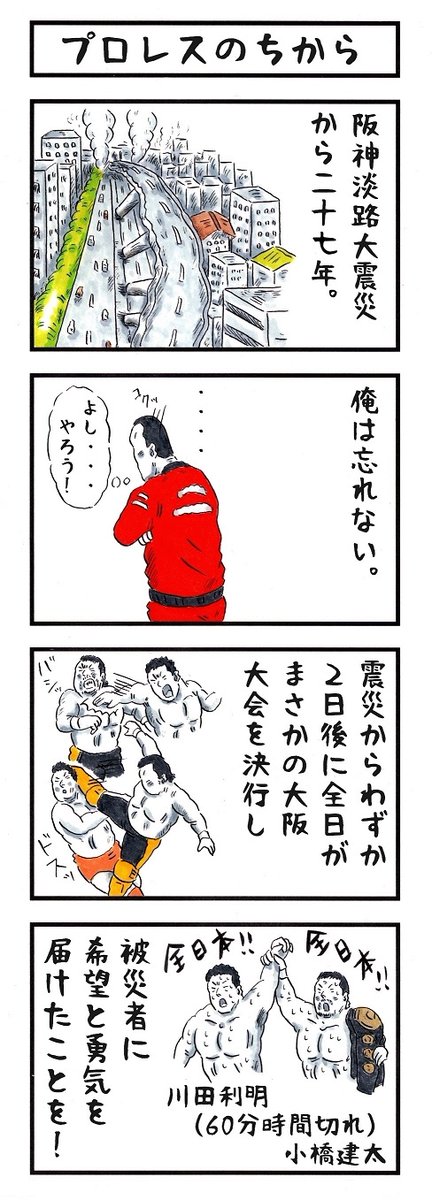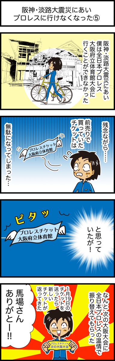見に行くはずだったプロレスを見に行けなかった話」描きました。 1月17日(火)阪神・淡路大震災から28年です。阪神・淡路大震災にあいプロレスに行けなくなった話 #プロレスの会場 #4コマ漫画 #漫画が読めるハッシュタグ #阪神淡路大震災 #震災28年 他の漫画はこちらから taiikukan.com/manga/