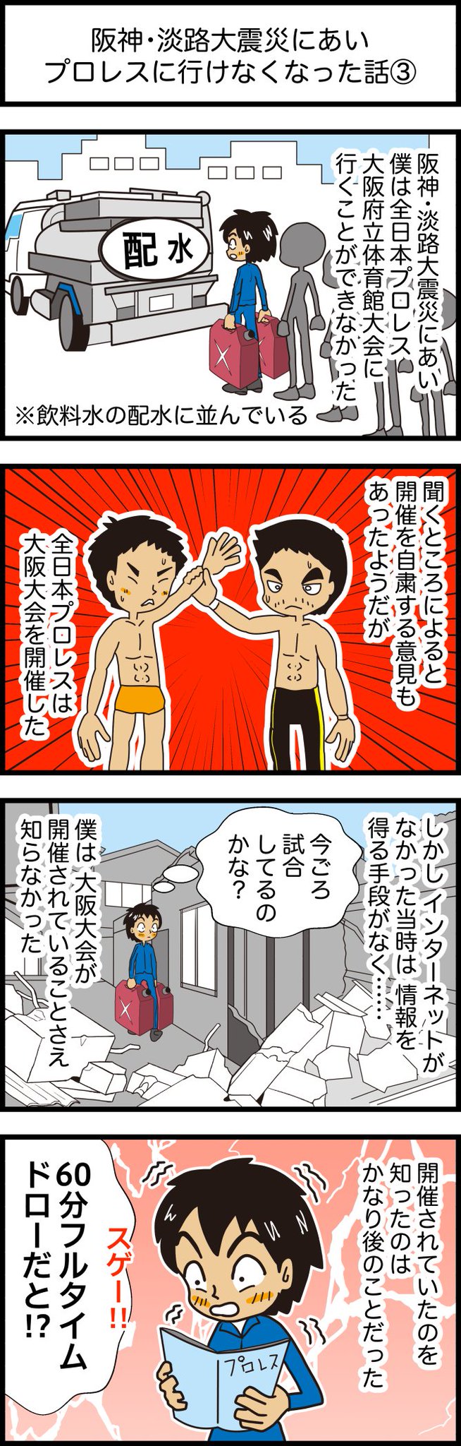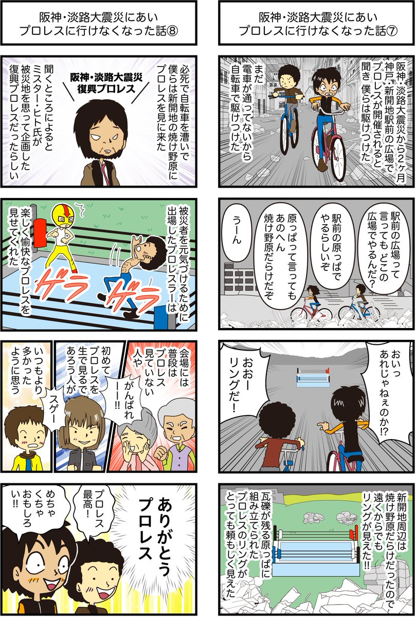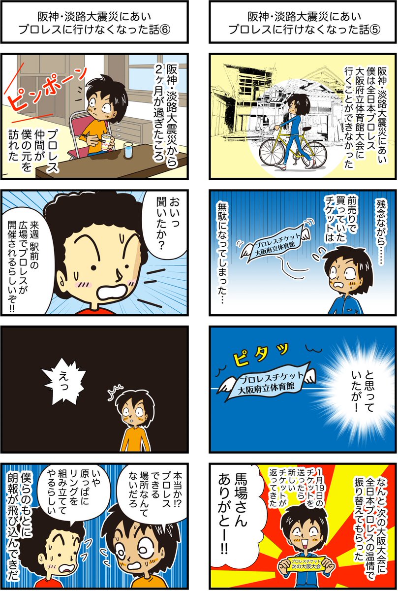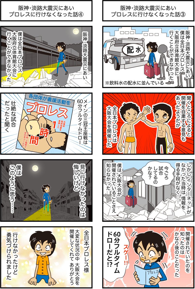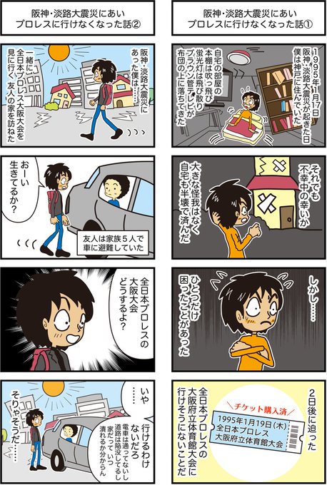 阪神・淡路大震災にあいプロレスに行けなくなった話 全8話の3回目 全日本プロレス大阪大会の結果を知ったのは、かなり後のことだったと思います。 開催してくれてありがとう。 #プロレスの会場 #4コマ漫画 #漫画が読めるハッシュタグ #阪神淡路大震災 他の漫画はこちら taiikukan.com/manga/tag/eart…