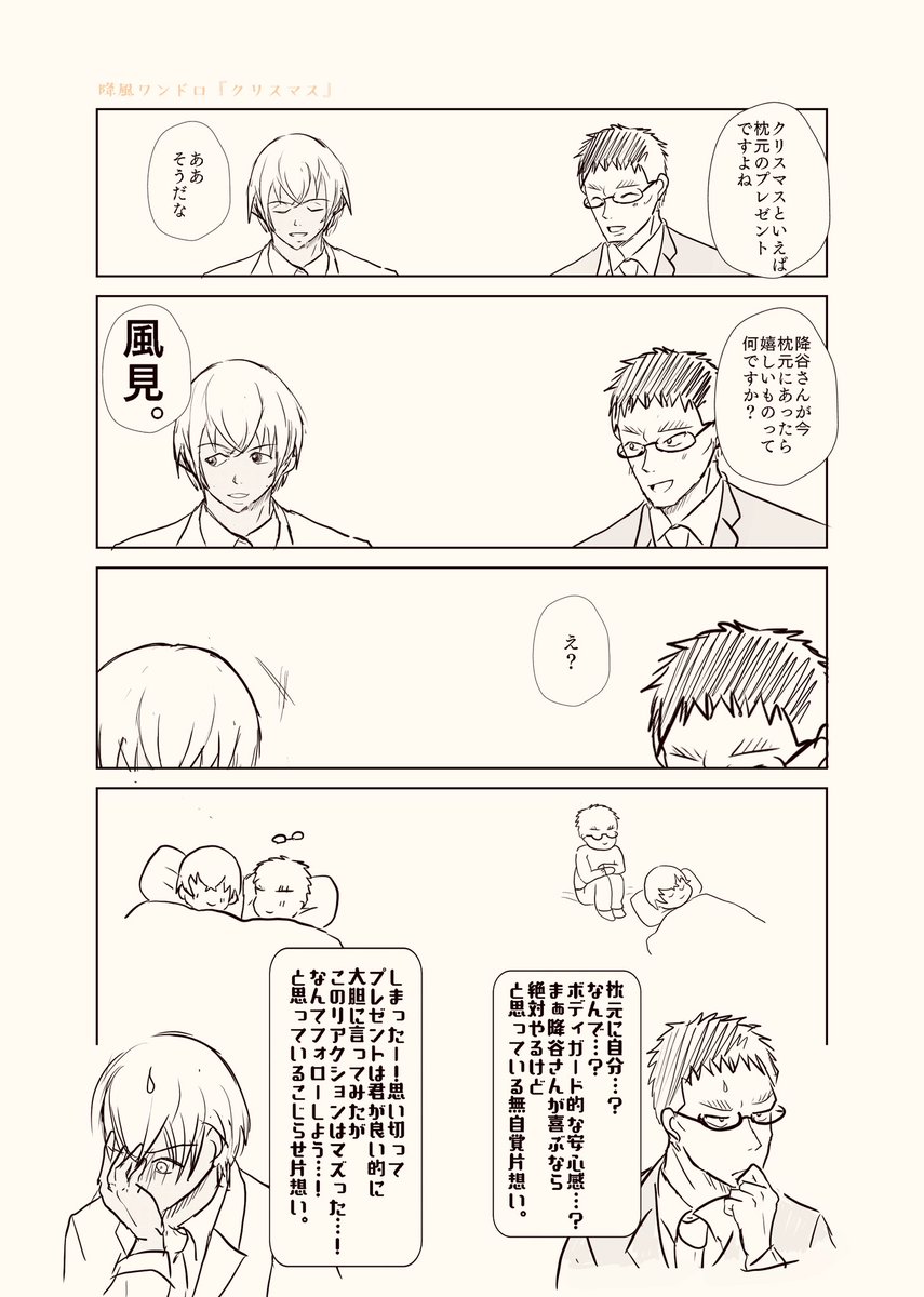今更だけどタグ使わせていただきます🙇♂️🙏 風「たまに冗談通じないんだよな…」 降「部下が輝いて見えて(物理)何でもしてあげたくなった」などと供述しておりメリークリスマス🎄🎅🎁 #降風ワンドロ #降風ワンクリスマス