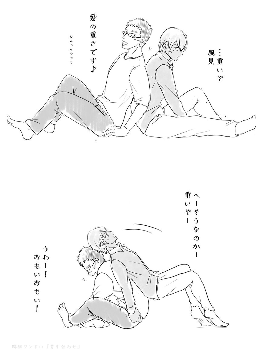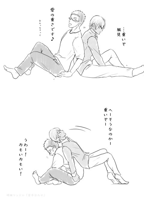 #降風ワンドロ #降風ワン背中合わせ 開催ありがとうございます! ただのらぶらぶかっぷる。 背中合わせでもたれあってたら。 降風ワンドロ『背中の重さは愛の重さ』 (その後風さんはのしかかられすぎて若干股関節を痛めた)