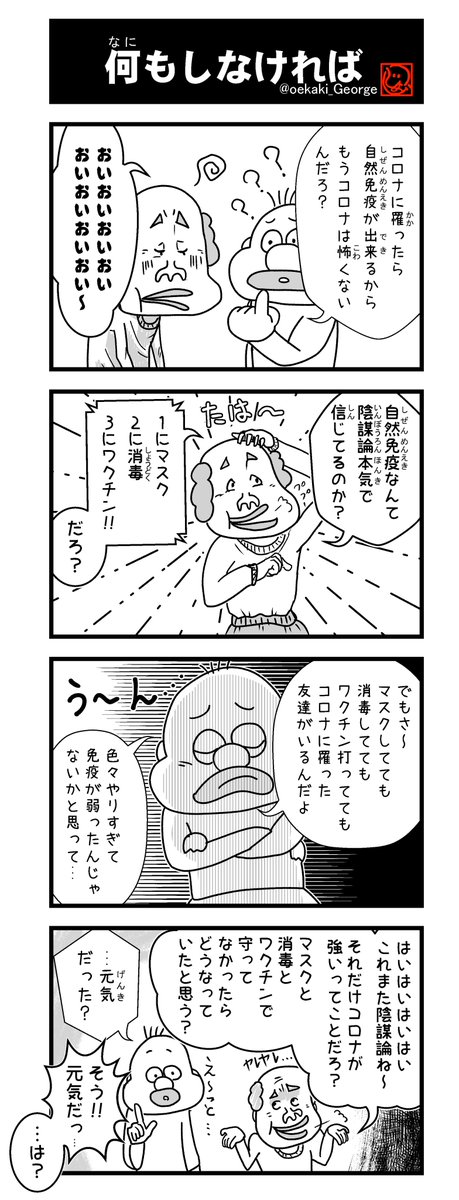 そろそろ隠しきれない...🥺 #ジョージの4コマ No383 「何もしなければ」 #4コマ #4コマ漫画 #コロナ #陰謀論 📗続コロナは概念好評発売中 resast.jp/stores/article… 👼不定期メルマガ resast.jp/subscribe/1477… 💡イベント、最新情報一覧 smart.reservestock.jp/consecutive_ev…