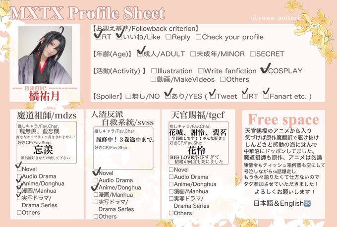 見事に中華沼に落ちました!雑多垢ですが作品好きな方と繋がれたら&色々語れたら嬉しいです!RT中心に❤️もお話が合いそうな方お迎えに伺います! #mxtxProfilesheet #魔道祖師好きさんと繋がりたい #魔道祖師レイヤーさんと繋がりたい #陳情令好きさんと繋がりたい #天官賜福好きさんと繋がりたい