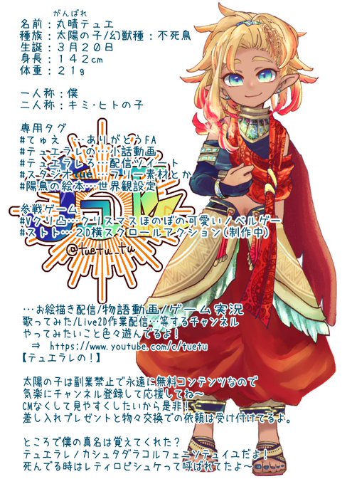 太陽の子 テュエだよ☀ 創作Vtuberかなぁよろしくね! ◆youtube【テュエラレの!】 … youtube.com/c/tuetu ◆資料置きFANBOX … tuem.fanbox.cc ◆欲しいモノ … amazon.jp/hz/wishlist/ls… ◆giftee … giftee.com/u/tuem?show_po… ◆タグ #てゅえ / #陽鳥の絵本 / #テュエラレろ