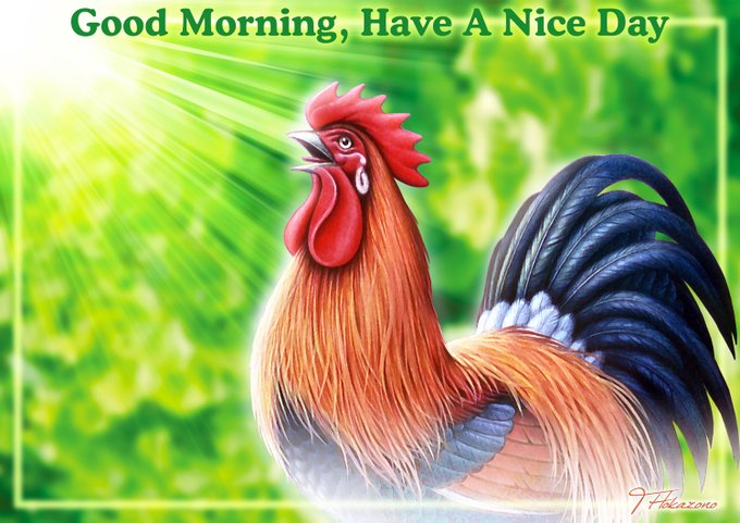 「 Good Morning, Have A Nice Day 」 ポスター制作で疲れたので息抜きに作りたい絵を 制作、やり終わった後の朝の気持ちです。 #雄鶏 #朝日 #緑 #美術ネットワーク #photoshop #イラスト好きさんと繋がりたい #アート好きな人と繋がりたい