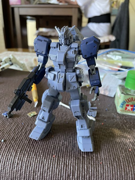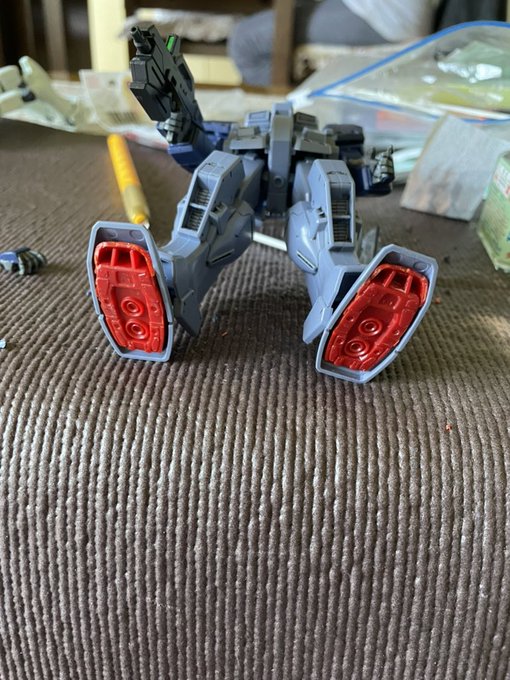 んで接地性がクソ過ぎてちょっとしたことでコロッと転がるしょっぱさを改善すべく部品取りに使われてるエントリーグレードガンダムのスリッパを切った貼った削ったして移植。接地性は格段と良くなった #ガンプラの画像貼るとRTされると聞いて #ヘイズル改 #雑誌付録