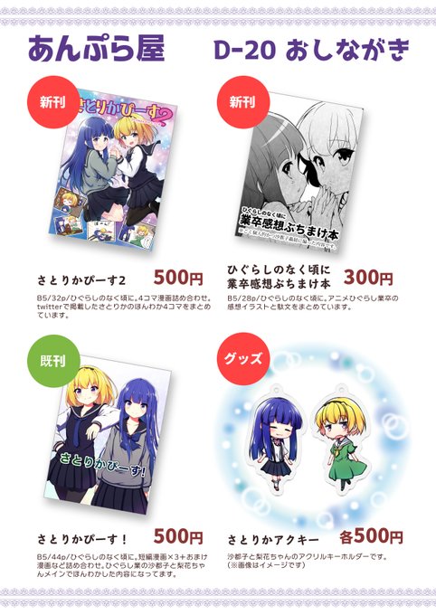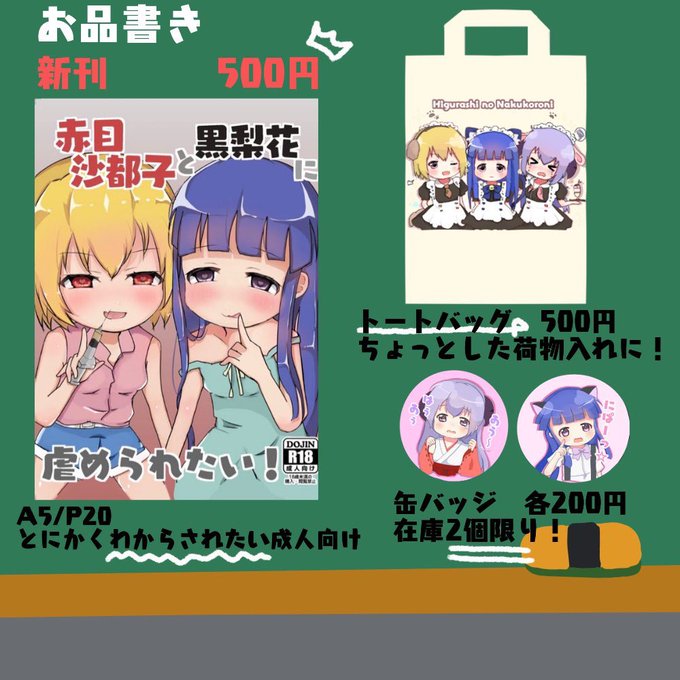 11/21「雛見沢村綿流し祭11」のお品書きです!✨ 【新刊】赤目沙都子と黒梨花に虐められたい!A5/P20/500円 【グッズ】トートバッグ500円•缶バッジ200円(グッズはどれも数少なめです😣💦) また当日までにBOOTHにて沙都子ちゃんのDL版写真集を出せたら出します💪 よろしくです〜〜 #雛見沢村綿流し祭11