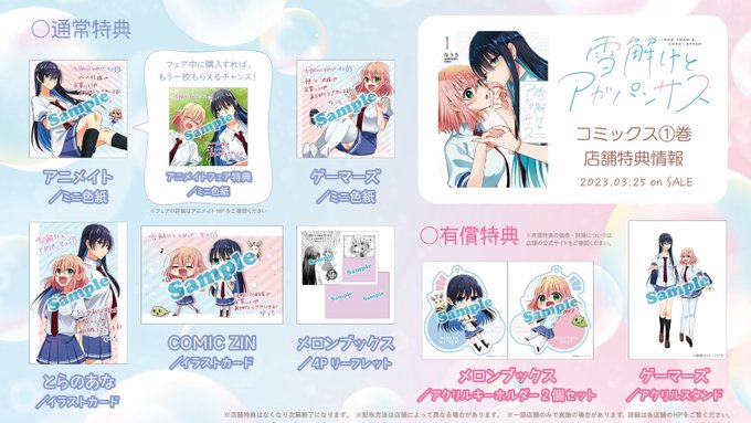【❄️店舗特典🌸】 3/25(土)発売 #雪解けとアガパンサス ①巻の店舗特典一覧です!全て描きおろしです。たくさんあります💪 有償特典を用意いただいている店舗さんもございますので、是非気になる特典をチェックしてみてください✨ よろしくお願いいたします!