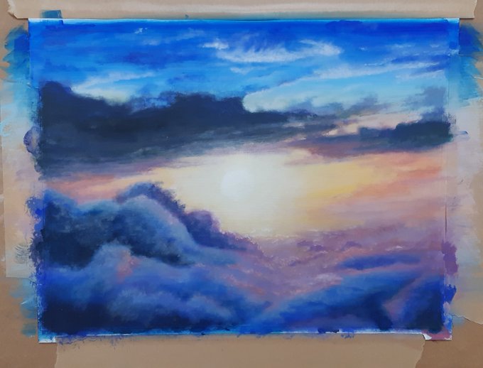 社畜化中ですが時間見つけて少しずつ少しずつ描いてます。7割位。ずっと描いていたい。この歳になってようやく自分がやりたいことを見つけた。 高く高く、遠く遠く。 F6 #アクリル画 #風景画 #夕陽 #雲海 #空 #絵描きさんと繋がりたい #イラスト好きさんと繋がりたい