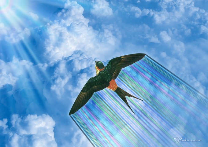 今日 家の前で周回しているツバメを見た 多分数年前から軒下に子育てに来たツバメの孫かひ孫だと思う(たぶん) 以前の写真と、今日よく飛んで来たツバメのイメージ(自分の気持ちに置き換えた) #燕 #雲海 #Photoshop #美術ネットワーク #絵描きさんと繋がりたい #イラスト好きな人と繋がりたい