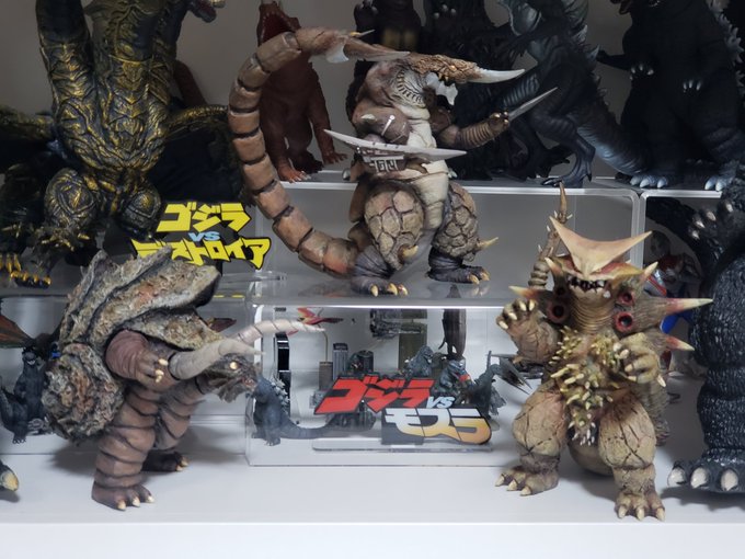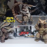 とりあえずグリッドマン怪獣3体を棚に。場所がないのでメタル怪獣はアクリルの奥に行きました😅グリッドマンのアクリルロゴほしいなぁ。。しばらく15cmばかり眺めてたら、20cmとか30cmの怪獣のでかいことw #電光超人グリッドマン
