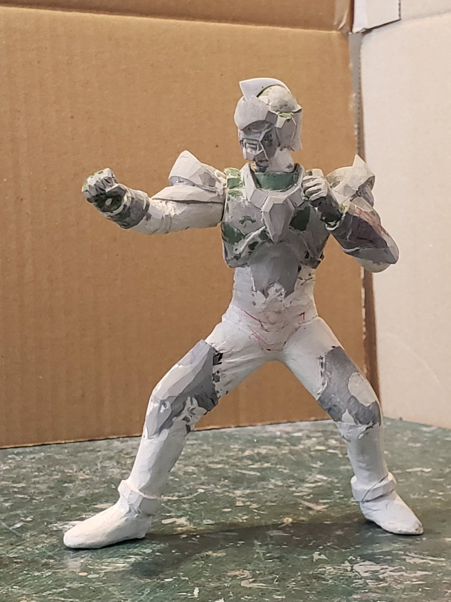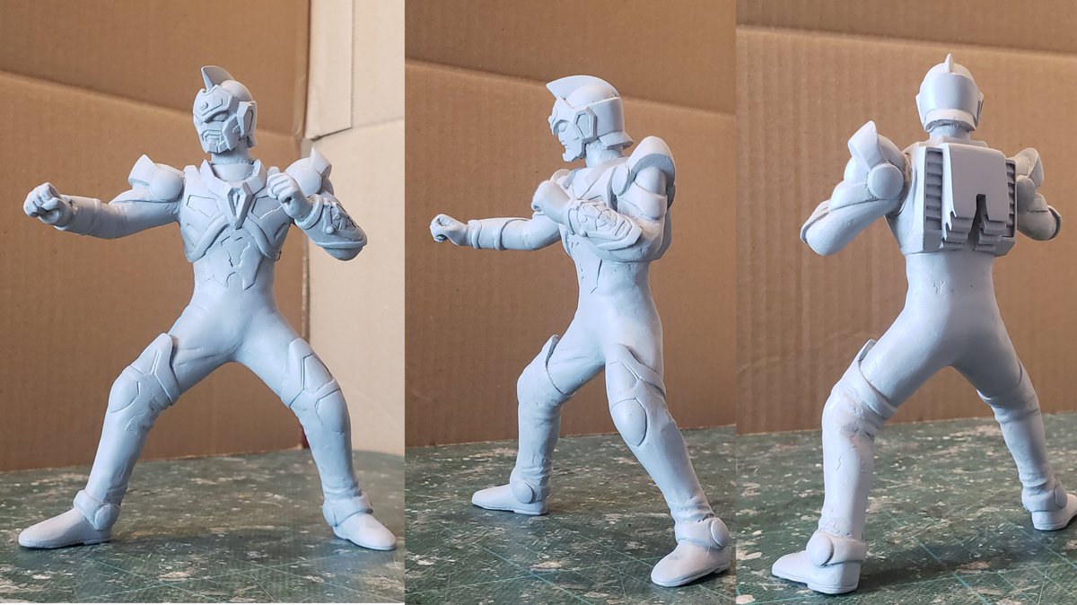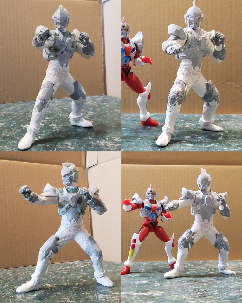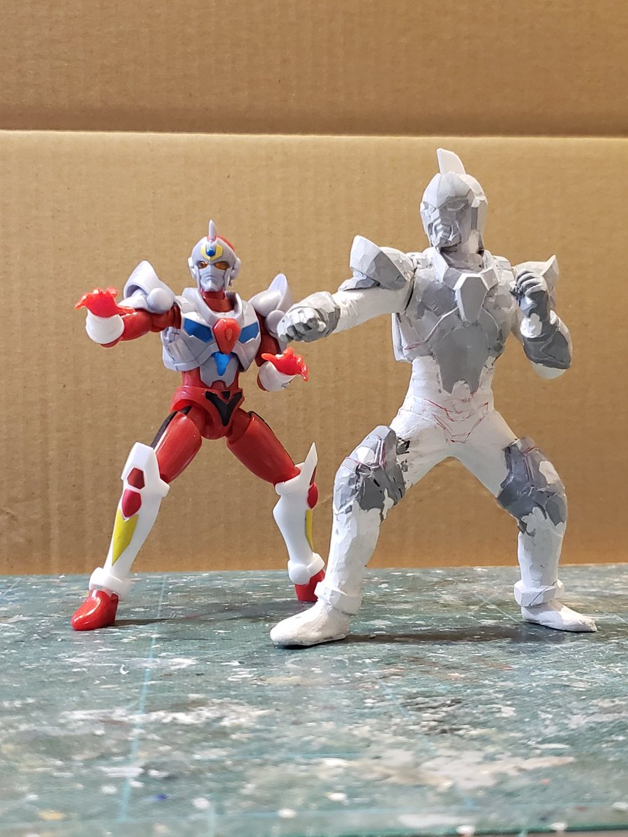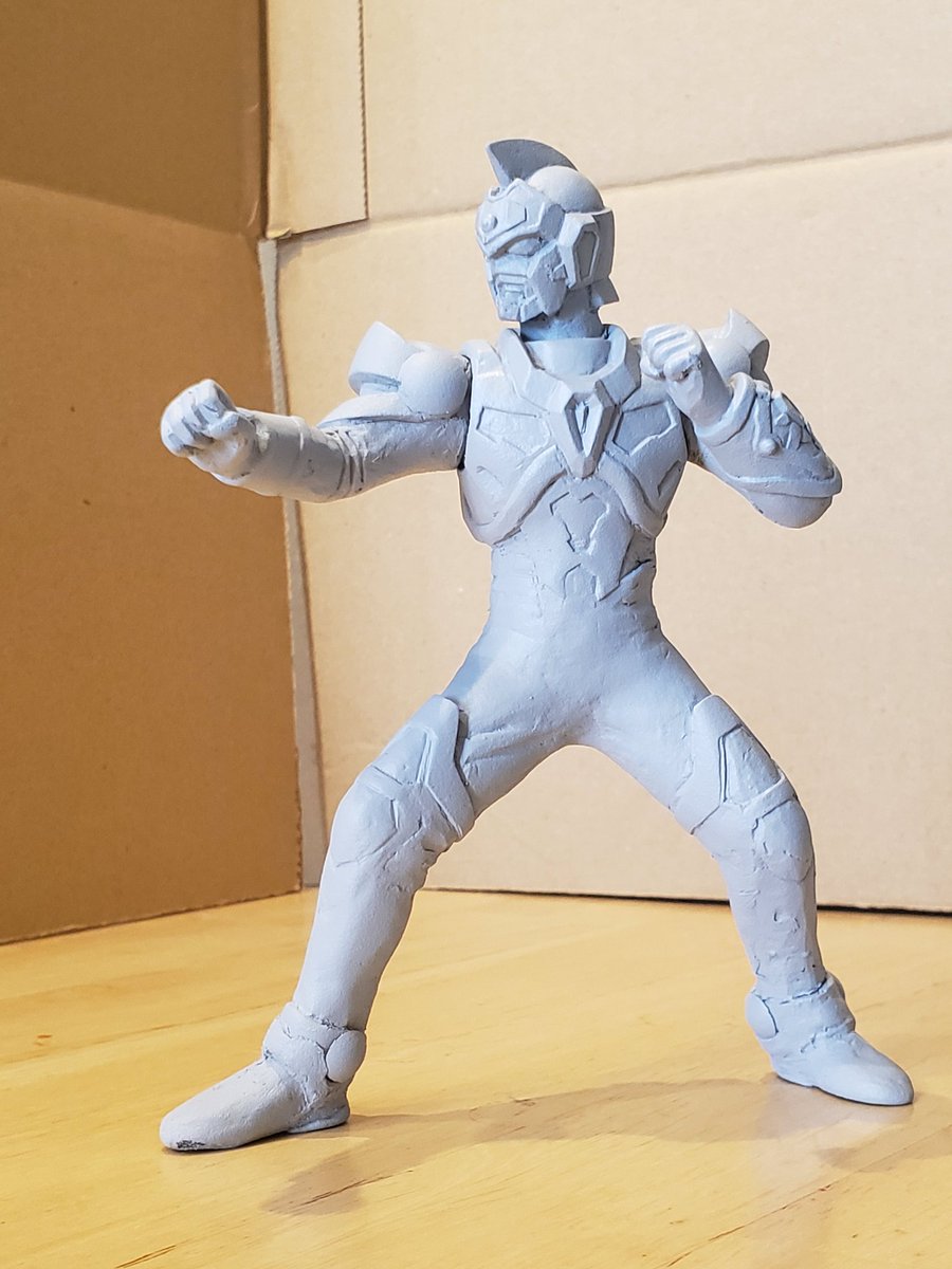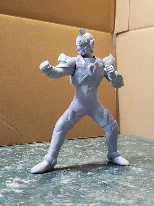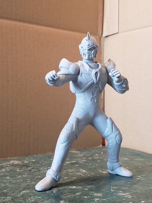 並行でチビチビやってて、やっと形が出来て来たのでコソッと😅怪獣たちに合わせたルミナスサイズのグリッドマンをスクラッチしてます。ヒーローは初めてなんで四苦八苦😅マスクやプロテクターはエポパテで削り出し。まだポーズ不自然なんで切って直さないとです。。#電光超人グリッドマン