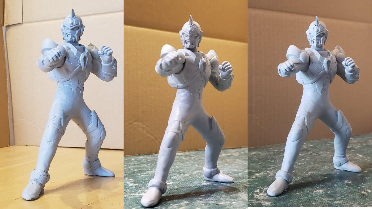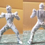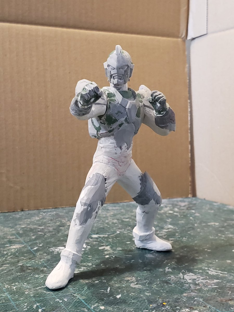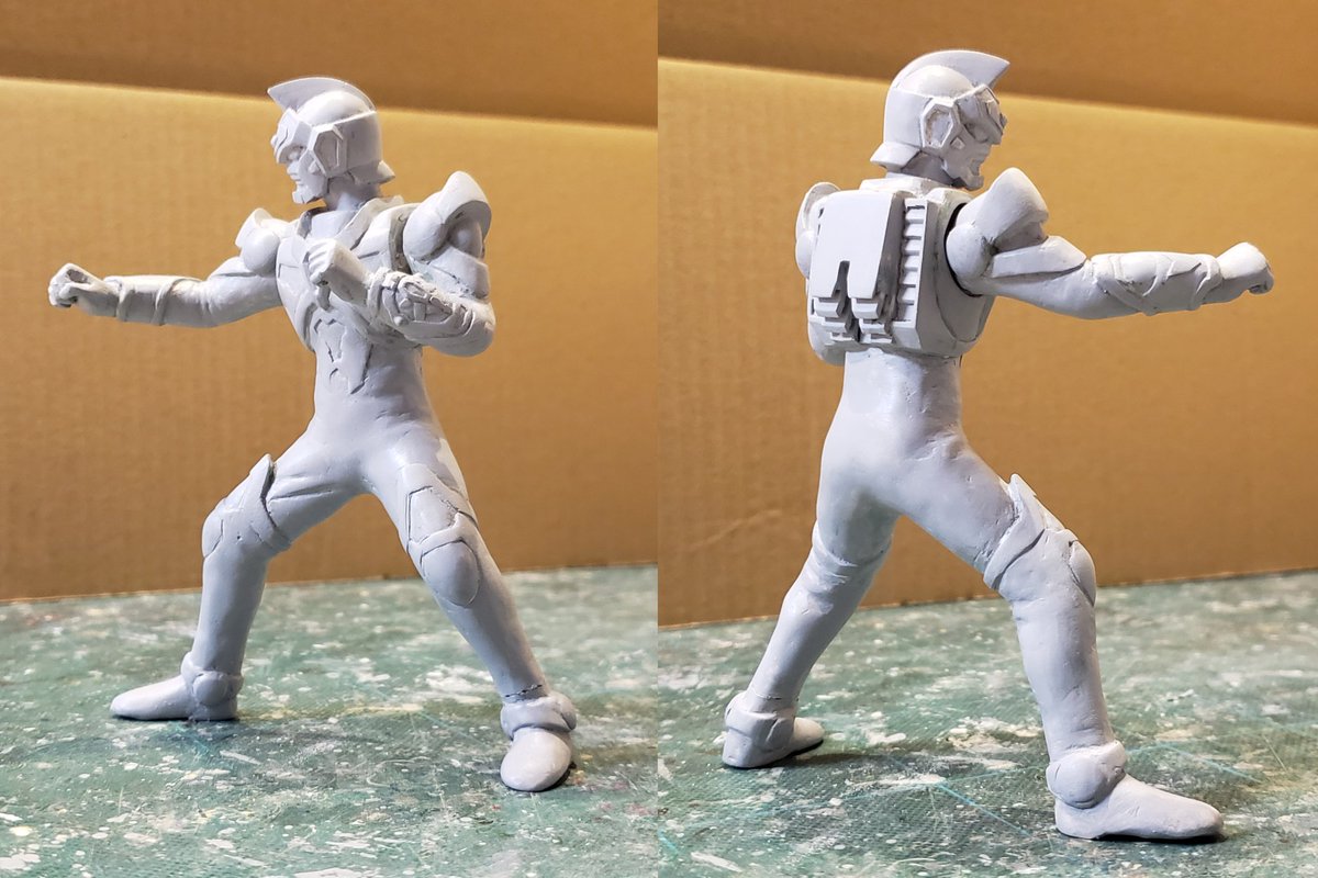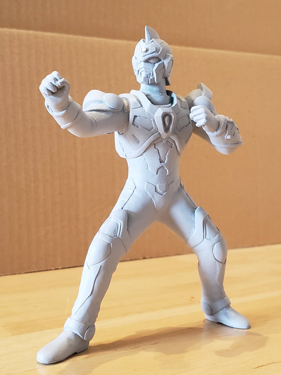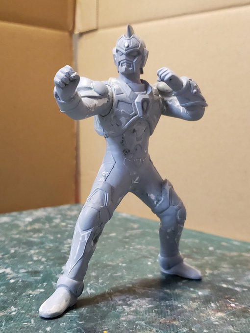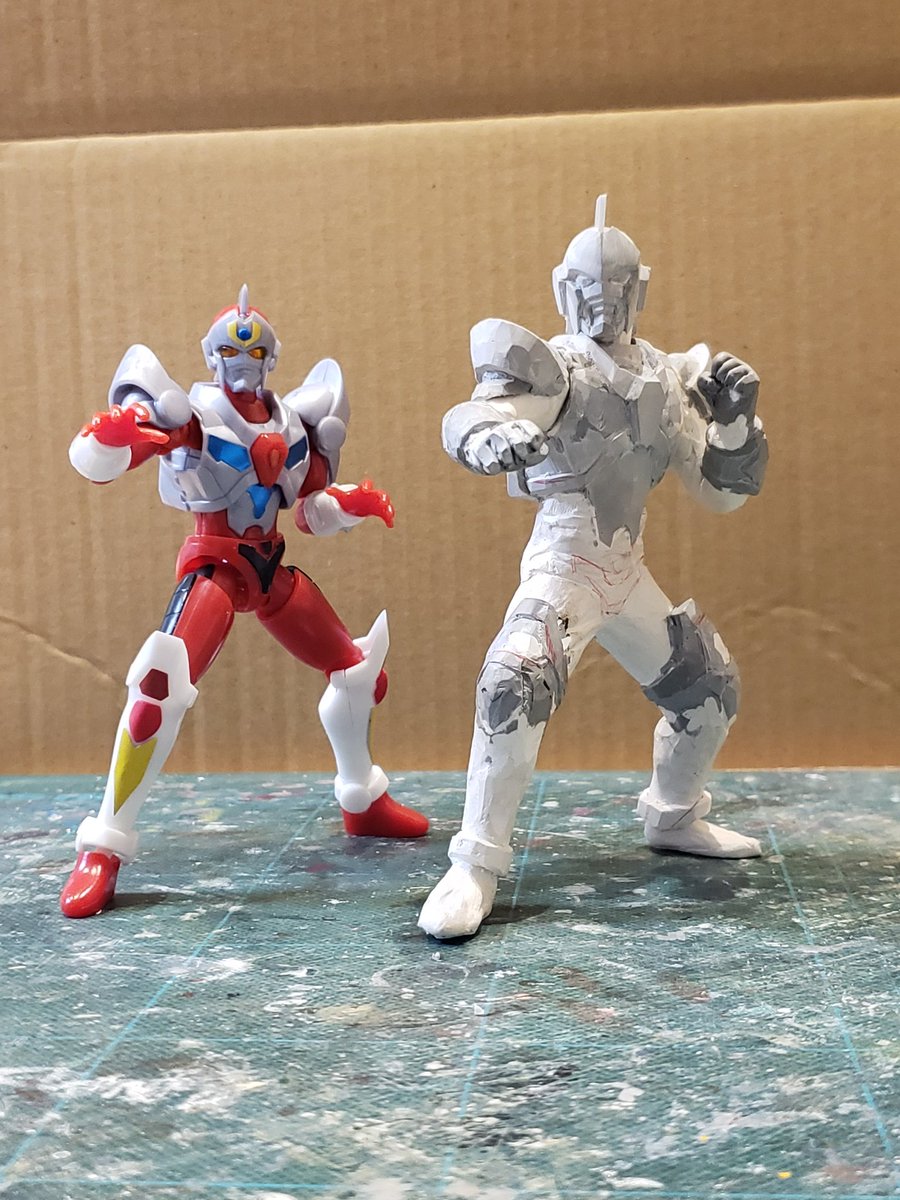 並行でチビチビやってて、やっと形が出来て来たのでコソッと😅怪獣たちに合わせたルミナスサイズのグリッドマンをスクラッチしてます。ヒーローは初めてなんで四苦八苦😅マスクやプロテクターはエポパテで削り出し。まだポーズ不自然なんで切って直さないとです。。#電光超人グリッドマン