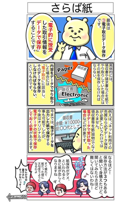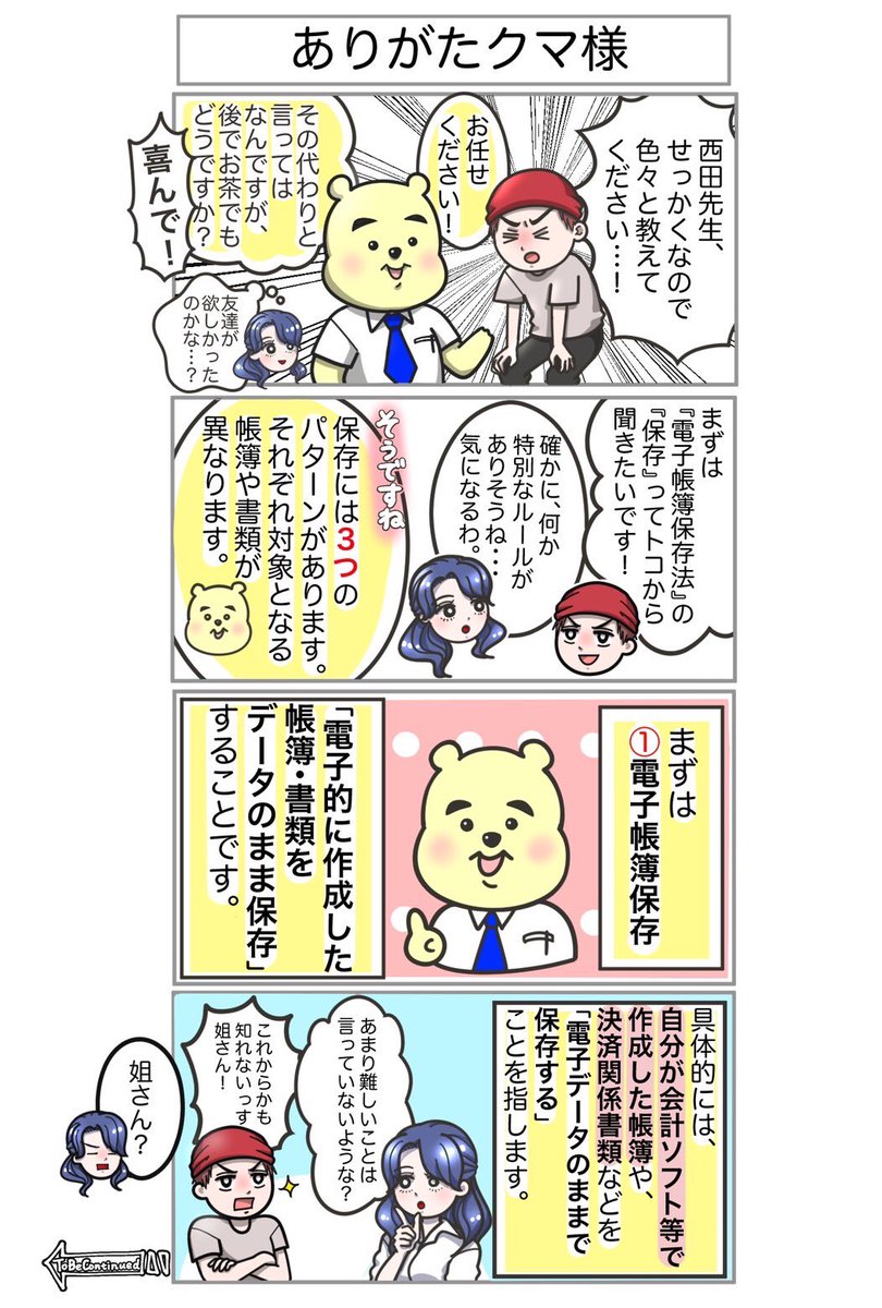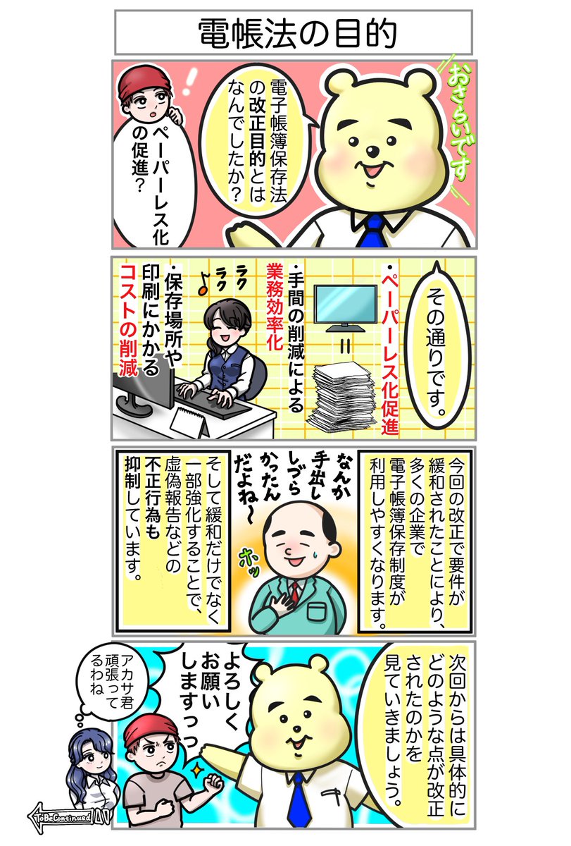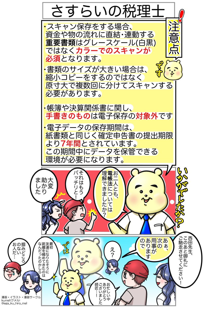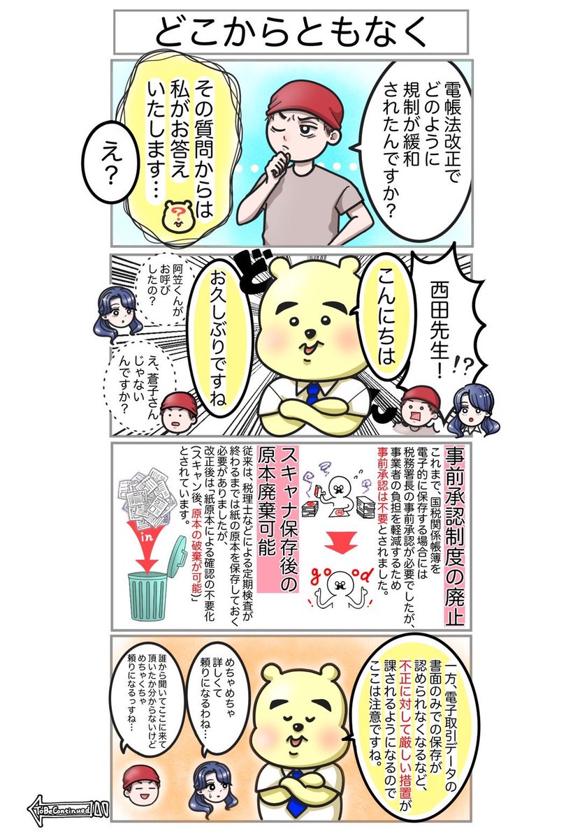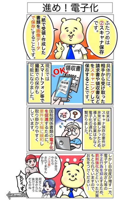 第2弾 教えて🧸改正電帳法🧸 第3回〜どこからともなく〜 改正された【#電子帳簿保存法】では、規制が緩くなったりとペーパーレス化を進めるために盛り込まれた点が多い。 悩める2人のもとへ遊びに来てくれた西田先生と一緒に、確認しよう!👔 #漫画が読めるハッシュタグ #漫画好きと繋がりたい
