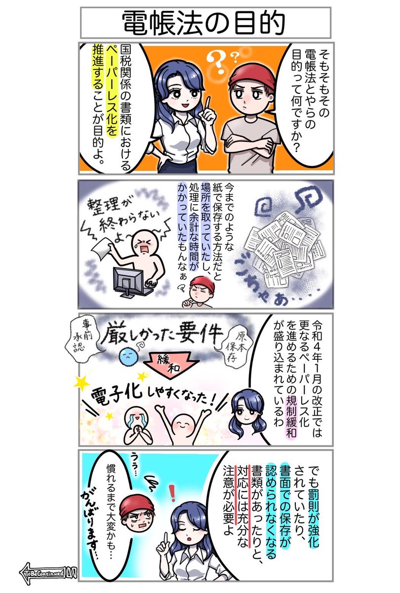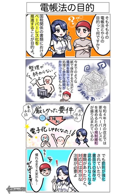 第2弾 教えて🧸改正電帳法🧸 第2回〜電帳法の目的〜 【#電子帳簿保存法】は、そもそも何のために #法改正 されたの? そのような最初に抱く疑問は、この #4コマ漫画 をチェックして少しずつ解消していきましょう✏️ #漫画が読めるハッシュタグ #漫画好きと繋がりたい