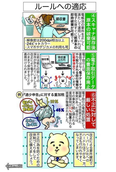 第2弾 教えて🧸改正電帳法🧸 第9回〜ルールへの適応〜 【#電子帳簿保存法】では、ペーパーレス化に向けて、制度が緩和もしくは厳罰化されました。 以前よりもハードルが下がったことで手を付けやすくなる一方、不正への処罰は厳しくなります。 #漫画が読めるハッシュタグ #漫画好きと繋がりたい