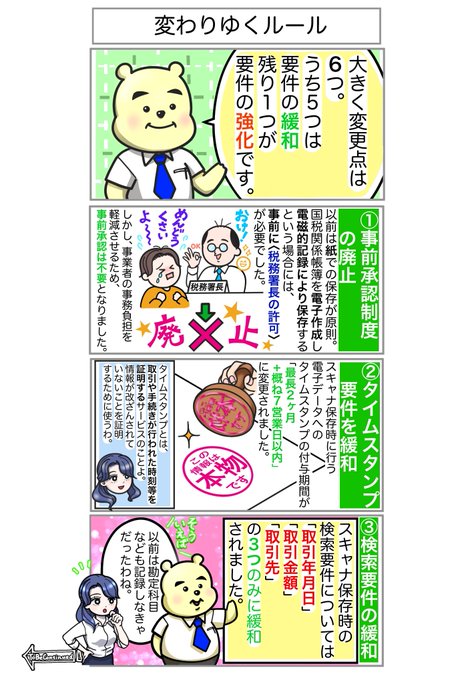 第2弾 教えて🧸改正電帳法🧸 第8回〜変わりゆくルール〜 【#電子帳簿保存法】では、以前のようなお固いルールをいくつか緩和して、ペーパーレス化の促進を図っています❗️ 紙のコストや保存場所、作業の手間などといった負担を無くしていきましょう✨ #漫画が読めるハッシュタグ #漫画好きと繋がりたい