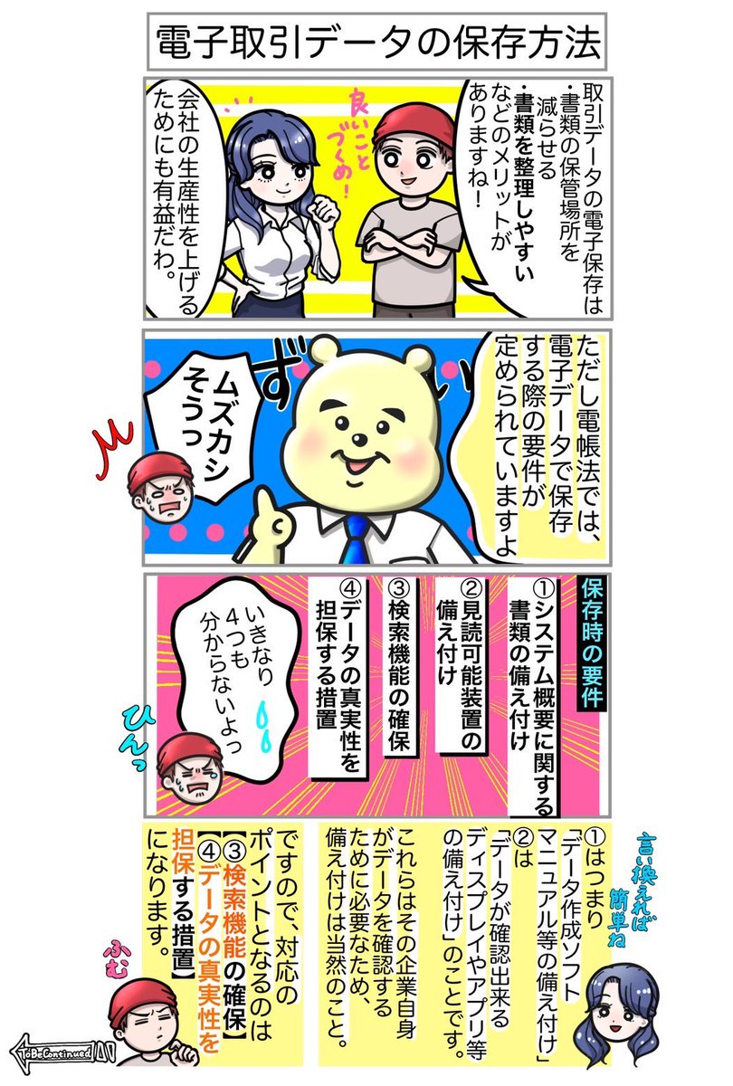 第2弾 教えて🧸改正電帳法🧸 第10回〜電子取引データの保存方法〜 【#電子帳簿保存法】における4つの要件のハナシ。正しく運営していくためにはやはり決まりごとがいるのです。 難しいことはありません!一緒に電子化へ一歩ずつトライしましょう🔥 #漫画が読めるハッシュタグ #漫画好きと繋がりたい