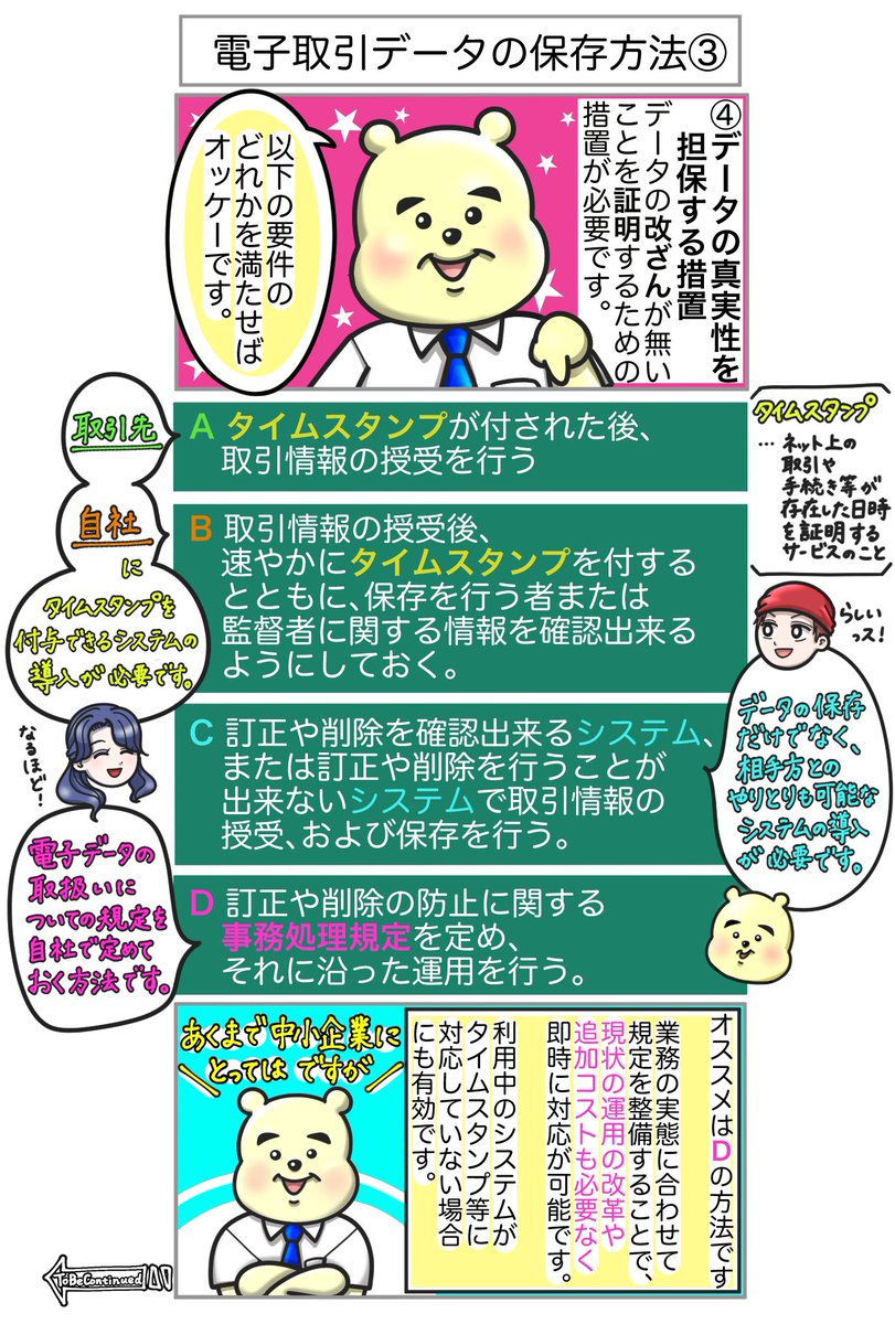 第2弾 教えて🧸改正電帳法🧸 第12回〜電子取引データの保存方法③〜 今回は【#電子帳簿保存法】での、電子帳簿の保存方法を4つ紹介します📝 あなたの会社の現状に合った方法を見つけて、この制度に対応していきましょう✊ #漫画が読めるハッシュタグ #漫画好きと繋がりたい