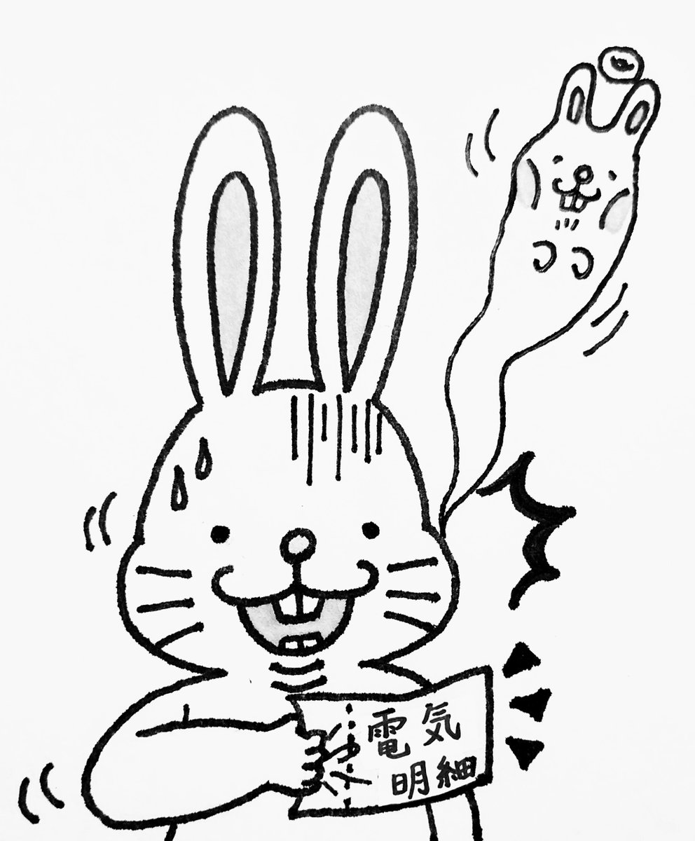こんにちは🌈 前歯うさぎさんです🐰🥕 今日はシュール&モノクロです🍙✨ 【電気明細は突然に! ~目のサイズもアップ↑~】 #イラスト #前歯うさぎ #イラスト好きさんとつながりたい #絵描きさんと繋がりたい #rabbit #illustration #art #design #電気代 #色々アップ