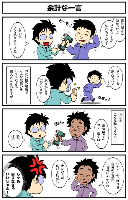 アラフォー男の電気工事士マンガ【第132話】 マンガ【転電虫】更新しました。 時々、こんな職人さんいませんか? #転電虫 #全ツイ建 #電気工事士 #漫画 #漫画が読めるハッシュタグ #4コママンガ #絵描きさんとつながりたい tendenmushi.com/manga/electric…