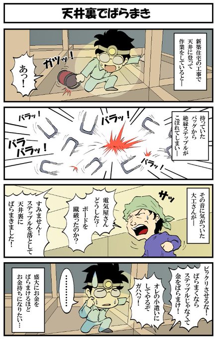 アラフォー男の電気工事士マンガ【第133話】 マンガ【転電虫】更新しました。 電気工事士による、ばらまき事件…。 #転電虫 #全ツイ建 #電気工事士 #漫画 #漫画が読めるハッシュタグ #4コマ #絵描きさんと繋がりたい tendenmushi.com/manga/electric…