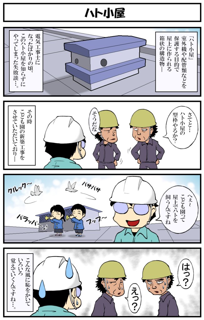 アラフォー男の電気工事士マンガ【第146話】 マンガ【転電虫】更新しました。 こども園で「ハト小屋」と聞いて…。 過去作も一緒にどうぞ♪ #転電虫 #全ツイ建 #電気工事士 #漫画 #漫画が読めるハッシュタグ #4コマ漫画 #絵描きさんと繫がりたい tendenmushi.com/manga/electric…
