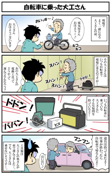 アラフォー男の電気工事士マンガ【第148話】 マンガ【転電虫】更新しました。 自転車に乗った大工さんの話。 過去作もどうぞ♪ #転電虫 #全ツイ建 #電気工事士 #漫画 #漫画が読めるハッシュタグ #4コマ漫画 #絵描きさんと繋がりたい tendenmushi.com/manga/electric…