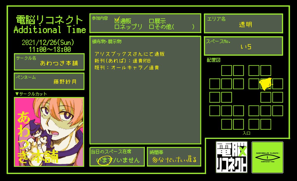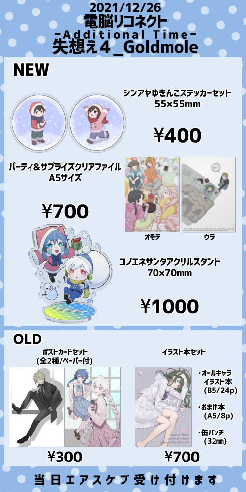 電リコATお疲れ様でした! 主催様、スペースに来ていただいた方、リクエストをくださった方ありがとうございました!頒布物の発送は1月中旬までを目標にしています。 エアスケブですが、リクエストをいただいた分は描ききろうと思いますのでよろしくお願いします…💦 #電脳リコネクトAT