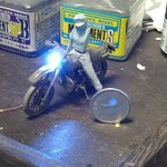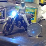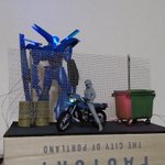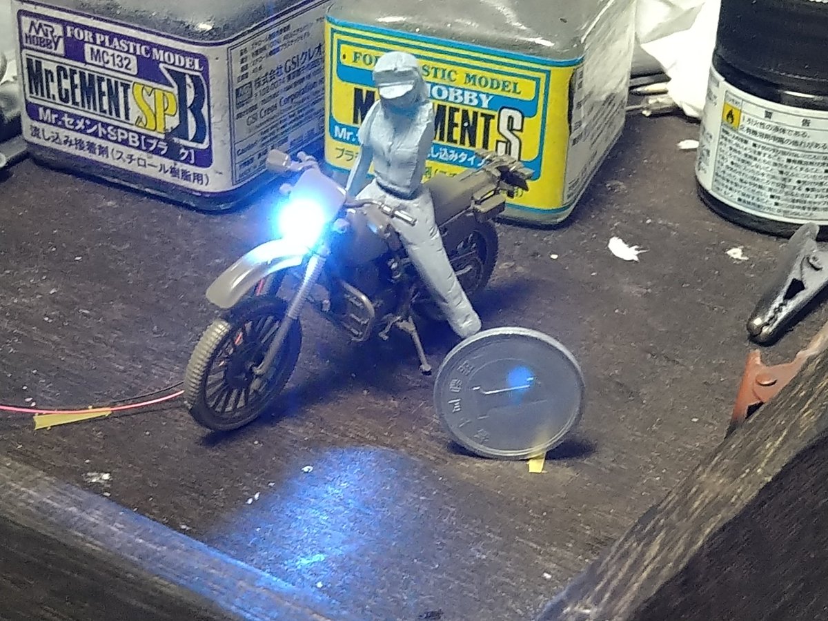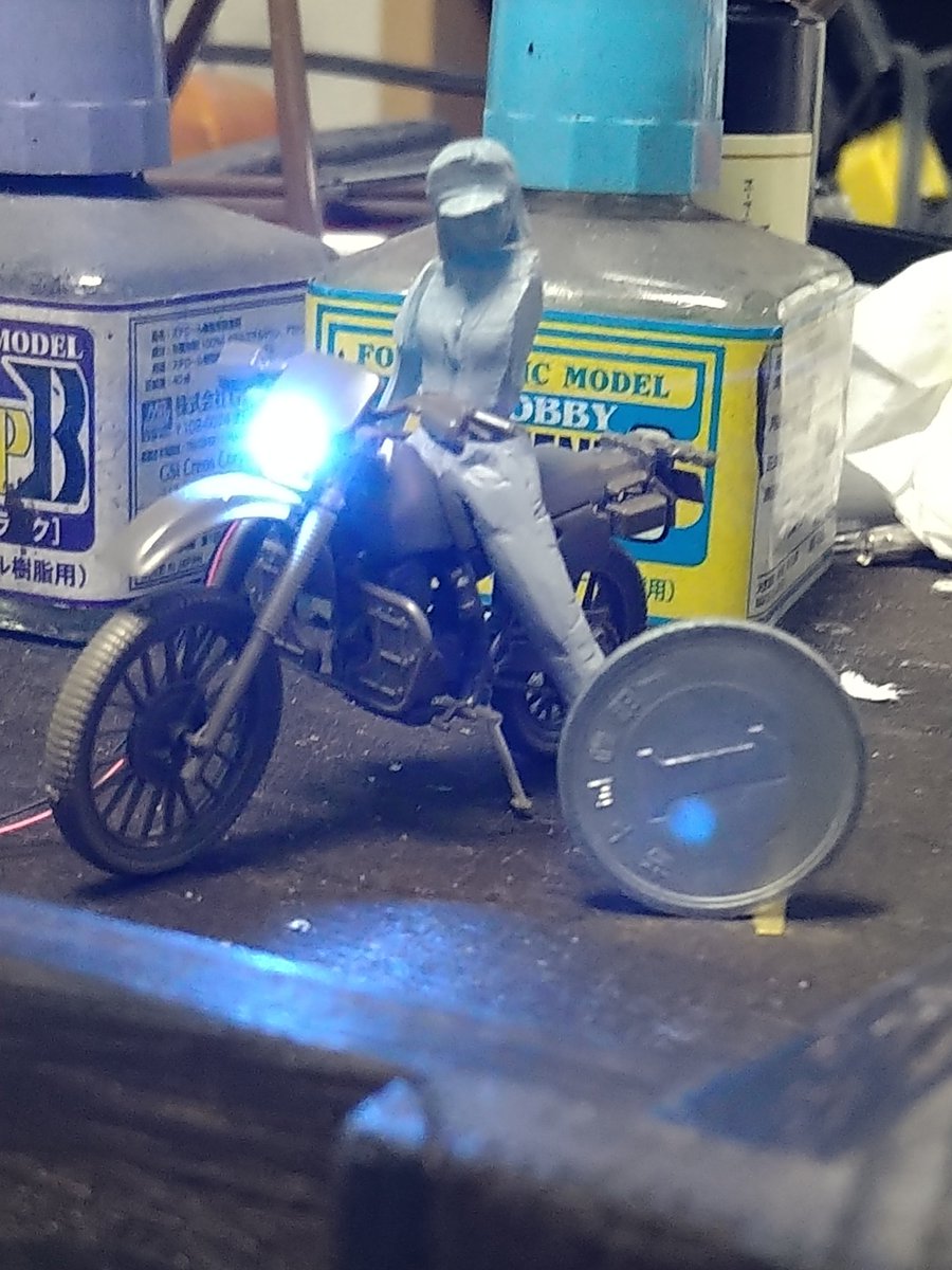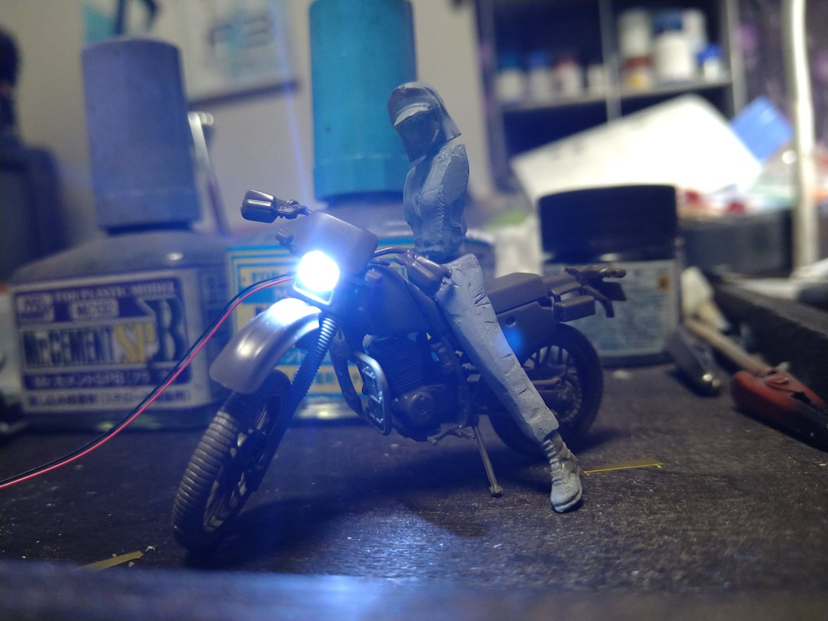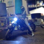 ウルトラQのジオラマ製作、予定の部分まで消化できたので、本日午後からは香貫花を少々😊 せっかくだから、バイクのライトも光らせたよ。 カッコイイよ🤤(自画自賛) 左腕のポーズが決まらない🤔来週末までの宿題だな。 #パトレイバー模型部 #香貫花 #電飾