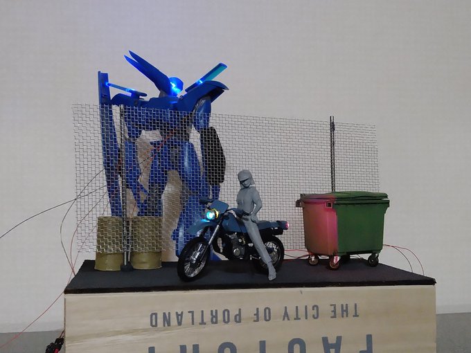 よくご覧なさい。バイクのテールランプがゴミ箱に反射する見せ方、コレは成功したと言って良いだろう。そしてここからが本題ですが、零式の電飾、頑張った割には目立っていない🤔 #パトレイバー模型部 #香貫花の物語 #電飾