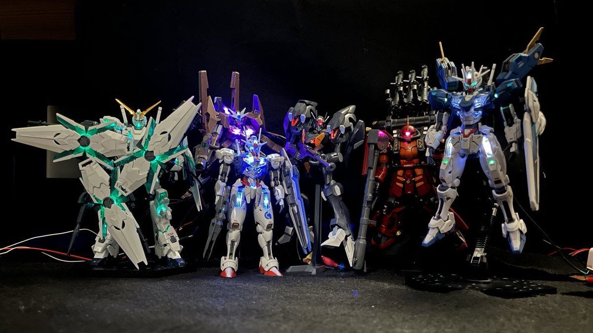 #今年作ったプラモ晒そうぜ #ガンプラ 4体と #コトブキヤ の #メタルギアレックス で合計5体、全て #部分塗装、#電飾、#ウェザリング で仕上げました。 #MGEX ユニコーンは部品の多さ、メタルギアレックスはスプリッター迷彩に苦労しました。 来年もコツコツゆっくり製作していきたいです。