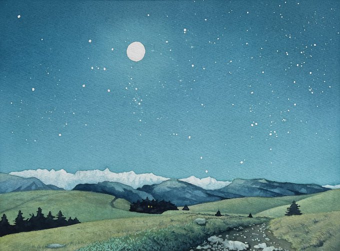 #みんなで楽しむTwitter展覧会 #art #ArtistOnTwitter #illustration #イラスト #Watercolor #水彩 #透明水彩 #霧ヶ峰 霜月二十日の晩 碧く冷たい月の光が、世界をどこまでも照らしていました。 (続く)