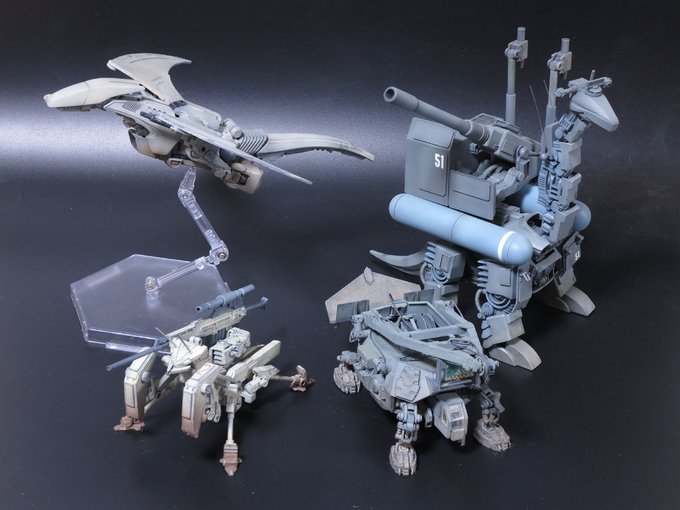 そろそろ締切も近いので集合写真をば。 4/18に初投稿してちょうど4ヶ月で、共和国帝国2作品ずつで陸海空その他を一通り。 間にワンフェスがあったことを考えたら頑張った方かな。 次があったらまた参加するよ~ #非公式ゾイドオルタナティブ風コンペ完成品 #非公式ゾイドオルタナティブ風コンペ