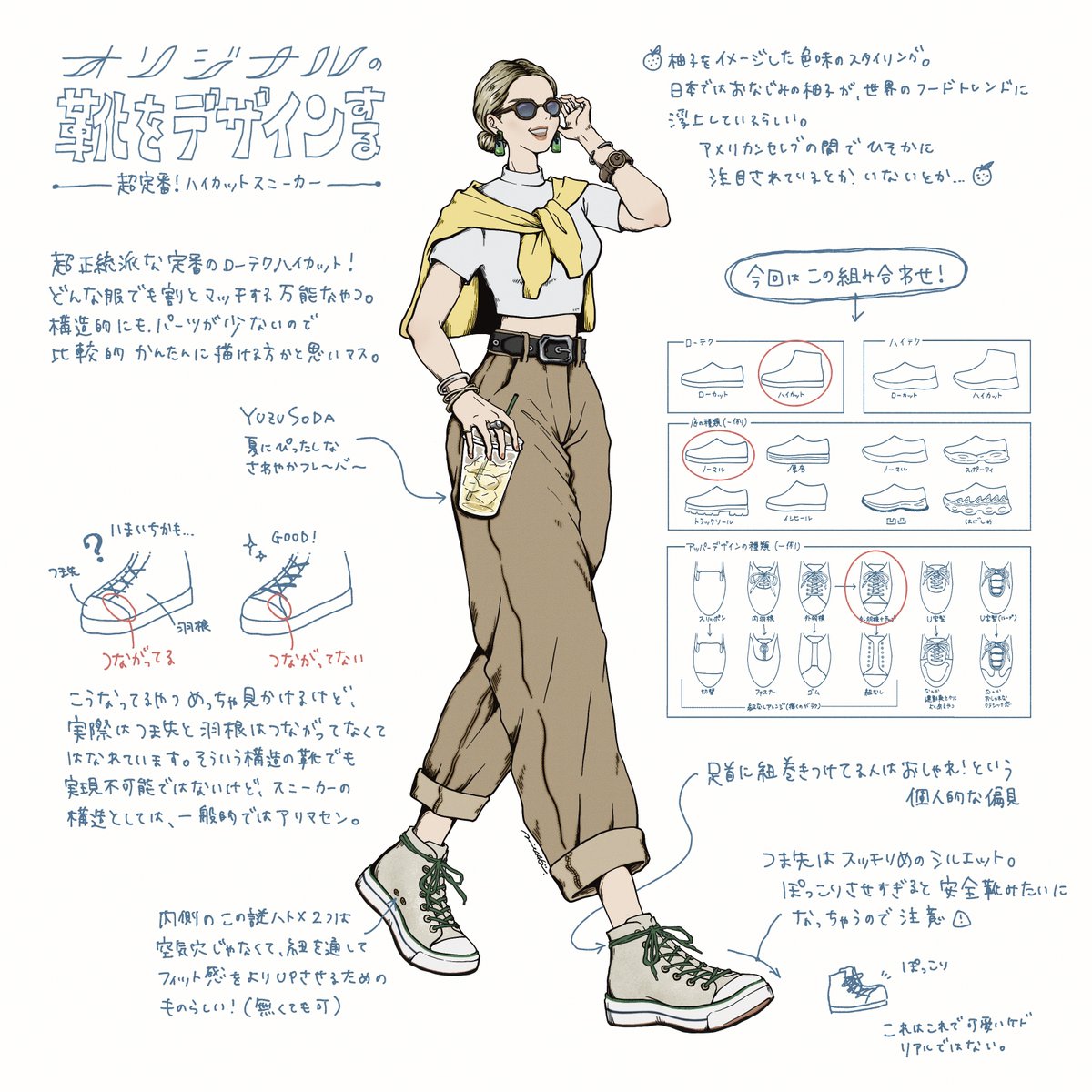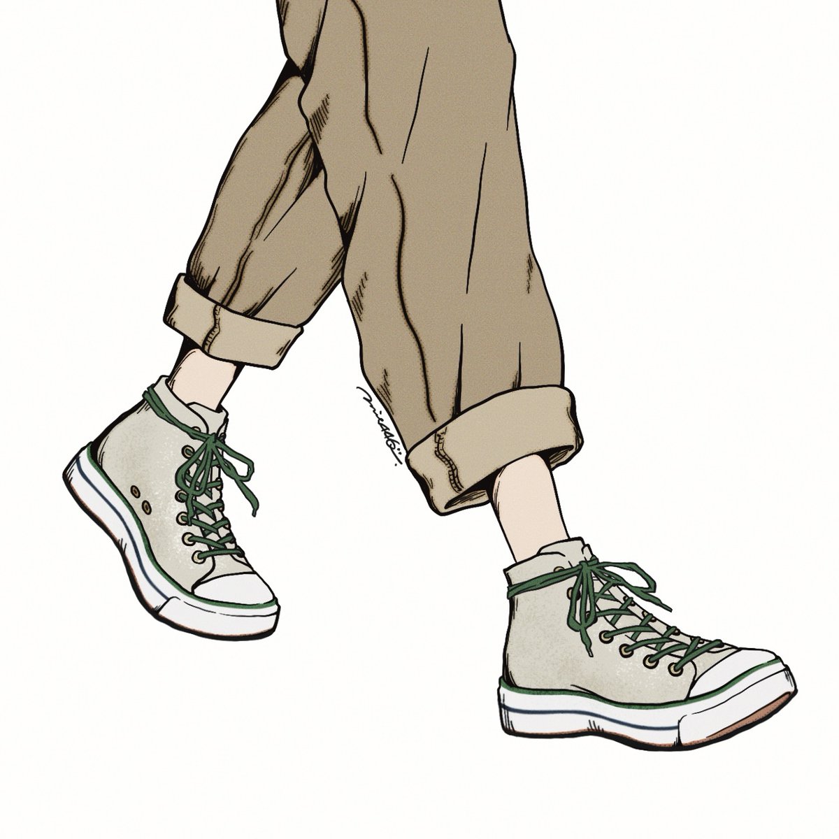 よくある定番スニーカーを描く時のコツ、というかポイントなのですが、つま先の白いパーツと、羽根(紐を通す穴が空いてる部分部分)は繋がってません⚠️ あとつま先は意外とぽっこりしてなくて、スマートなシルエットにしてあげると、シャキッとキマると思います🕺🏼✨ #靴の描き方tips