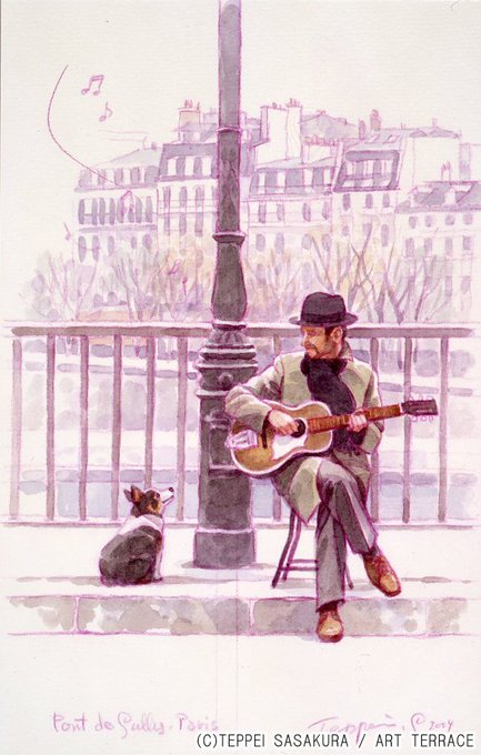 笹倉鉄平ちいさな絵画館で開催中の「"音色"感じる作品」展へのご感想 「落ち着いた気持ちになれる美術館でした。」 『シュリー橋のギター弾き』展示中 kaigakan-teppei.net #笹倉鉄平 #画家 #アート #絵 #音楽好きな人と繋がりたい #ギター好きな人と繋がりたい #音色 #音楽 #ギター #コーギー