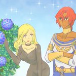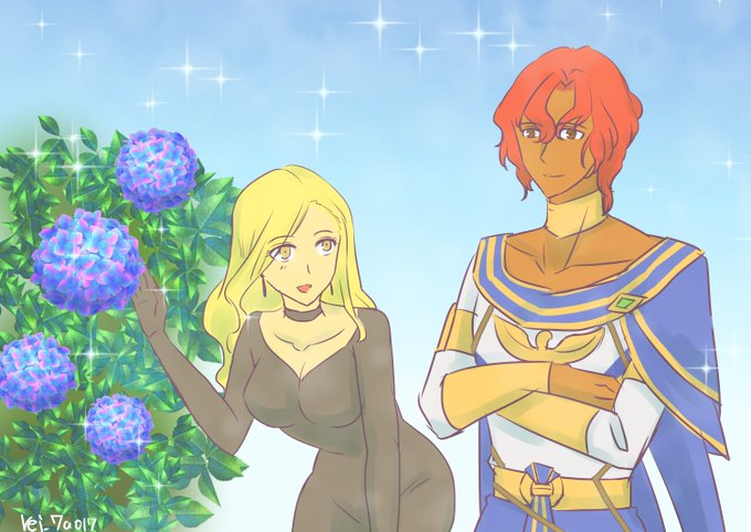ツードロくらいで描いた雨上がりテュキ。「見て下さいテュオ!この紫陽花、大きさが私の顔と同じくらいあります!」とはしゃぐキを微笑ましく見つめるテュ🌺 いくらワンドロとはいえこんな出来でupして良いのか…?(ワンドロ初挑戦) 紫陽花は素材をお借りしました。 #領民のワンドロワンライ